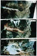 - (Upper) Dacite lava dome had grown continuously since May 1991, generating pyroclastic flows which cascaded down along the Mizunashi River in the eastern flank of Mt. Fugen. On 3 June 1991, pyroclastic flows killed 43 people in the evacuated area along the Mizunashi River. Casualties including three volcanologists, Katia and Maurice Krafft and Harry Glicken, were found in pyroclastic surge deposits. (Middle and lower) Both 8 June and 15 September 1991 flows travelled 5.5 km from the source. Pyroclastic-flow deposits extended their distribution area with time. Pyroclastic flows descended along the Oshiga-dani valley (northeast of the dome) and the Akamatsu-dani valley (southeast), respectively. (photos by Kokusai-kogyo Co., Ltd.)