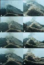 - Most of pyroclastic flows of this eruption were of Merapi-type, i.e. they are generated due to simple gravitational collapse of lava blocks from the margins of the lava dome. Looking from the southern side of the Akamatsu-dani valley, these sequential photographs show a pyroclastic flow moving toward the viewer. Turbulent ash-cloud, which appears to be sliding on the ground, had moved silently. (photos by Hiroshl Shimizu on 19 March 1992)