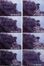 - As lava blocks are detached from dome front, these materials are broken into smaller pieces, similar to the action of building demolition by dynamite. The shocks of landing and collision triggered sudden expansion of high-pressure gas sealed within the pores of the lava dome. Cuntinuous effusion of gas from lava pieces during movement probably produces fluidal movement of pyroclastic flow. Successive rockfalls observed here have induced relatively large flows. The frontal cliff of lava dome in this photographs is about 50 m high. (photos by Tadahide Ui, on 2s February 1992)