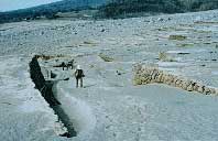 - Pyroclastic-flow deposits are composed of a main part (block-and-ash flow deposit) and a peripheral part (pyroclastic surge deposit). The former fills river and valley bottoms, while the latter is found mainly on relatively higher places. This slide shows the Kita-Kamikoba area devastated by the 15 September 1991 pyroclastic flows. The desert-like foreground comprises of pyroclastic surge deposits, while the background are primarily block-and-ash flow deposits. (photo by Setsuya Nakada on 23 September 1991)