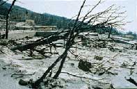 - (Upper) Heavy rain frequently triggered debris flows originating from the newly-laid pyroclastic-flow deposits and the upstream region covered by thick volcanic ash. Debris flows flooded over an area along the Mizunashi River, and the deposits extensively covered farmland and houses near the coast. (Lower) Pyroclastic flows reached the northwestern residential area of Shimabara City in May and June 1993; one person was killed by pyroclastic surge on 23 June 1993. (photos by Kokusai-Kogyo Co., Ltd.)